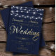 Einfache und moderne Hochzeitsvorlage. Goldkalligraphie auf einem rustikalen Hintergrund Navy Blue mit hübschen Saitenleuchten, die die Oberseite des Designs schmücken. Enthält auch UAWG Details und ist einfach mit Ihren eigenen Details zu gestalten.
