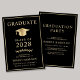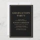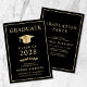 Elegante Ankündigung und Party Einladung von schwarzen Uni-Abschlüssen mit einer goldenen Graduiertenkappe und schlichter moderner Goldtypografie für den Namen des Absolventen, Jahrgang, Uni oder Universität, Abschluss und Dur oder Ehre. Fügen Sie auf der Rückseite die Details zum Abschluss hinzu.
