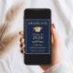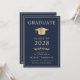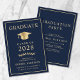 Elegante, dunkelblaue Uni-Abschluss-Ankündigung und Party Einladung mit einem goldenen Graduiertencap und schlichter moderner Goldtypografie für den Namen, das Jahrgang, die Uni oder die Universität, den Abschluss und die Hauptfach- oder Ehrengänge. Fügen Sie auf der Rückseite die Details zum Abschluss hinzu.