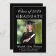 Klassische Ankündigung des Schwarzen Uni-Abschlusses mit dem Foto des Absolventen, seinem Namen und Klassenjahr in einem eleganten weißen Drehbuch und seiner Universität, Hauptfach und Auszeichnungen in der modernen weißen Typografie.