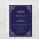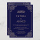 Islamisch-muslimische Art Hochzeitseinladungskarte für die Ehe Shaadi Zeremonie des Paares. Diese Karte hat eine luxuriöse Vintage barocke Schriftrolle in der Ecke der Grenze mit einem dunkelblauen Hintergrund. Auf der Vorderseite der Karte befindet sich ein eleganter Schriftart mit Goldschrift. Sie können die Informationen auf der Karte wie Name, Datum und Adresse personalisieren. Fügen Sie bei Bedarf Text auf der Rückkarte hinzu. Der weiße Umschlag ist inbegriffen.