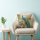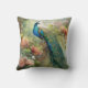 Dekorator werfen Kissen mit der Vintagen Malerei eines eleganten blau-grünen Pfaues in einem üppigen Wald von rot rosa Blumen und Grün.