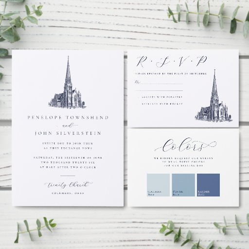 Beeindrucken Sie Ihre Gäste mit dieser eleganten formalen Hochzeitseinladung von Jessica Amber. Diese klassische Karte zeigt eine detaillierte Vintage Abbildung einer Kirche, die Sie durch ein Bild des Zielortes Ihrer Hochzeit ersetzen können (transparenter oder weißer Hintergrund bevorzugt). Die elegante, dunkelblaue Schrift zeigt die Namen der Braut und des Bräutigams sowie Einzelheiten der Hochzeit, einschließlich Ort, Datum und Uhrzeit. Diese Einladung wird bevorzugt, wenn das Ehepaar das Ereignis selbst ausrichtet. Durchsuchen Sie meine Sammlung nach der passenden Einladungssuite. ⚠ Wenn Sie die Kalligraphie bearbeiten und Sonderzeichen verwenden, kopieren und einfügen Sie sie von dieser Seite: bit.ly/Emeline-Script ⚠ ・ Für weitere Hochzeitssuiten, besuchen Sie mein Geschäft Zazzle.com/EventsByJessicaAmber ・ ・ Für benutzerdefinierte Bestellungen, schreiben Sie mir auf Zazzle.