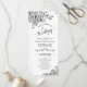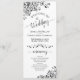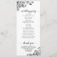 Dieses wunderschöne Hochzeitsprogramm besticht durch ein elegantes Schwarz-Weiß-Design mit schmalen Gürteln und Wirbel in den Ecken. Die Titel sind in extravaganter Schrift-Kalligraphie geschrieben, und es gibt Platz für Ihre Zeremonie und Hochzeitsfeier Details, sowie ein kurzes Dankeschön für Ihre Gäste. Ein wunderbarer Weg, um Ihre Freunde und Familie zu Ihrer Hochzeitsfeier zu begrüßen.