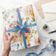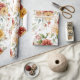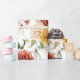 Elegante Aquarellrosen in Orange und Gelb in verschiedenen Bühnen blühen auf weißem Hintergrund. Orangefarbene und gelbe Blume mit fließenden Weinreben und Grünpflanzen.