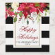 Elegantes Watercolor Red Poinsettia Happy Holidays Weinetikett mit schwarzen und weißen Streifen und Goldrahmen.