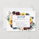 Die moderne Elegant Watercolor Burgundy Bloral Wedding RSVP Card beinhaltet bordeauxrote Rose, rosa Rosen, rote Blume, blaue Blumen, Sonnenblumen, Eukalyptus-Blätter und botanische Vegetation.