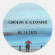 Schönes, elegantes Aquarell Roter Schirm Paar Hochzeitsaufkleber. Einzigartige, handgemalte Liebe, klassische Rundaufkleber. Personalisieren Sie Ihre Namen und das Datum der Hochzeit.
