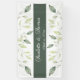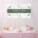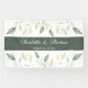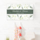 Elegantes Hochzeitsbanner mit weichen, grün-grünen Blätter, die von oben und unten fließen. Der Text an der Vorderseite enthält die ersten Namen und das Hochzeitdatum von Braut und Bräutigam. Einfach zu komplettierendes Vorlagendesign. Matching Hochzeit Einladung und Zubehör.Genießen Sie!