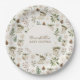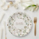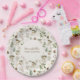 Elegante Weihnachtsdusche oder Winter Baby Dusche personalisierte Teller mit festlichen Mustern aus Aquarellbildern von Grünpflanzen, Strümpfen, Weihnachtsgeschenken und Kiefernfüßen.