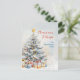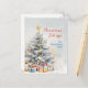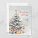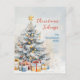 Ein eleganter Weihnachtsbaum in Vintager Wasserfarbe wird auf dieser schönen Urlaubspostkarte gezeigt. Hübsche Goldbaubles markieren den schneebedeckten Kiefer und der Oberteil ist ein heller Stern. Hübsche Geschenke und Pakete umgeben die Basis des Baumes. Der Gruß auf der Vorderseite der Postkarte ist "Weihnachtstidings", obwohl Sie dies zu einem anderen saisonalen Gruß ändern können, wenn Sie es vorziehen. Stellen Sie sicher, dass Sie den Familiennamen und das Datum des Beispiels bearbeiten.