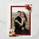 Dieses romantische und klassische Weihnachtsfoliendesign Save the Date zeigt Gruppen von roten und weißen Blume, Kiefern, Heiligenbeeren und rustikalen Zweigen, maßgeschneiderte, moderne Textgrafiken und bearbeitbare Textfelder, umgeben von einem reichen roten Damast-Rand mit goldenen Folienkanten. Zurück enthält eine zusätzliche Bildvorlage und Textfelder.