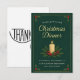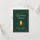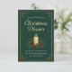 Veranstalten Sie ein unvergessliches und stilvolles Weihnachtsfest mit dieser eleganten Weihnachtsdinner-Einladung. Das Design zeigt einen schönen, dunkelgrünen Hintergrund mit subtilen Kiefernmustern und einer zarten goldenen Umrandung. Das Zentrum bildet eine warme, angezündete Kerze, umgeben von klassischen Stechpalmenbeeren und Kiefernnadeln, die eine gemütliche, traditionelle festliche Atmosphäre schaffen.