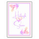 Das Blumendesign in hellen Rosa- und Violetttönen auf einer weißen Tischkarte eignet sich für Hochzeiten oder andere Party. Eine Seite hat die Braut- und Bräutigamen mit Kunstwerken, während die andere die Tischnummer hat.