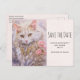 Save the Date Postkarte mit einer schönen Abbildung. Eine lange haarige weiße Katze sieht regal und elegant aus. Umgeben von rosa Blume, Gold und Diamantschmuck.