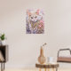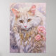 Ein Poster mit einer schönen Illustration. Eine lange haarige weiße Katze sieht regal und elegant aus. Umgeben von rosa Blume, Gold und Diamantschmuck.