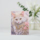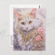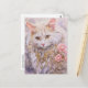 Eine Postkarte mit einer schönen Abbildung. Eine lange haarige weiße Katze sieht regal und elegant aus. Umgeben von rosa Blume, Gold und Diamantschmuck.