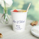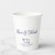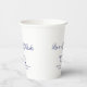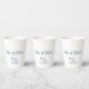 Elegante benutzerdefinierte Skriptnamen Datum Hochzeit Papier Cups. Mit eleganten zarten Herzen Detail. Blauer Text und weißer Hintergrund.