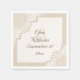 Elegante weiße Spitze mit Perlen beige Hochzeitspapierserviette mit blumenweißer Spitze auf beige Sand, die zwei Ecken eines weißen Rechtecks mit beigefarbenem Rand bedeckt. Text in braun. Beachten Sie, dass die Spitze "bedruckt" ist und nicht echtes Gewebe. Dieses elegante, elegante und romantische Shabby Chic-Design ist Teil eines Hochzeitsgeschehens und eignet sich hervorragend für ein elegantes Frühjahr-, Sommer- oder Herbst/Herbst-Brautparty, Empfang, Verlobung oder Jubiläum-Party mit neutraler Farbpalette.