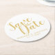 Minimalistisch Wedding Save the Date Paper Untersetzer enthält Titel "Save the Date" in modernen goldenen Skript-Schriftart mit Namen und Datum in modernen serifenlosen Schriftart auf weißem Hintergrund. Bitte beachten Sie: Die Details der Folie werden im Kunstwerk simuliert. Bei der Herstellung dieses Produktes wird keine Folie verwendet.
