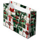Festliche und elegante Weihnachtsgeschenktasche mit einem Aquarellmuster von wunderschön verpackten Weihnachtsgeschenken. Weihnachtsgeschenke in Grün mit roten Bögen, Geschenke in Grün mit goldenen Bändern und Goldspuren verpackt, weiße Geschenke mit goldenen Bändern und roten Bögen, weiße Geschenke in roten Bändern mit heiligen und roten Beeren oben verpackt.