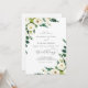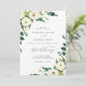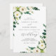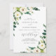 Diese elegante, weiße Blumen-Einladung ist ideal für eine klassische Hochzeit. Das moderne Vintage Design besticht durch eine wunderbar romantische Elfenbein- und Cremefarben-Rose und Blume mit dunkelgrünen Blätter, Grünpflanzen und Botanicalen.