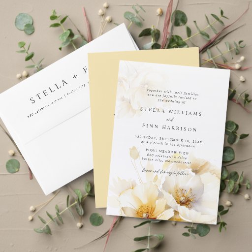 Elegante rustikale moderne Acryleinladungen mit Aquarellgelb goldfarbenen Blume Blumenmuster, Klassik und Drehbuch.