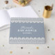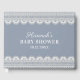 Elegante weiße Spitzen, die die Grenze auf einem staubigen blauen Hintergrund darstellen. Passen Sie das Gästebuch mit dem Namen des Mama-to-be- und Baby-Duschdatums an.