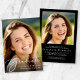 Feiern Sie die Errungenschaften Ihres Absolventen mit dieser eleganten Ankündigung und Party Einladung des schwarzen Abschlusses. Ihr Foto füllt die Vorderseite der Karte mit "Graduate" in einem schicken weißen Skript; darunter, ihren Namen, Schule und Klasse Jahr in klassischen weißen Serifen Typografie. Auf der Rückseite, fügen Sie ein zusätzliches Foto und Ihre Graduiertenparty Details in einfachen weißen Buchstaben.
