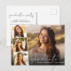 Elegante Ankündigung von Abschlüssen und Party Einladung Postkarte mit dem Foto des Absolventen überlagert mit einem Streifen von drei kleineren quadratischen Fotos und "Graduate" in einem modernen weißen Skript und ihren Namen und Klasse Jahr in der einfachen weißen Typografie. Fügen Sie auf der Rückseite die Details zum Party hinzu.