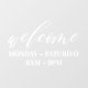 Elegante und minimale Geschäftsspeicher Stunden Verkleidung. Das Design bietet ein "Welcome"-Design in einem eleganten Schriftart im Stile weißer Schriften. Passen Sie Ihre Geschäftszeiten an.