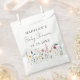 Elegante Blumenduschsäcke mit einem unteren Rand von Aquarellfarben und Blattwerk in Rosa, Gelb, lila, Blau und Grün auf weißem Hintergrund. Die Wildblume Baby Dusche Taschen mit dem Namen der Mutter und dem Datum. Die personalisierten Wildblumen Gaumenbeutel sind ideal für Frühjahr- und Sommerduschen.