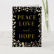 Diese elegante und festliche Urlaubskarte besticht durch eine wunderschöne Grenze zwischen Heiligen, Eukalyptus und Beeren, die mit einer Goldfolie aus erhöhtem Gold auf einem schicken schwarzen Hintergrund besticht. Der erhöhte Gruß auf der Folie sagt "Liebe und Hoffnung Frieden". Es gibt einen anpassbaren Gruß und Text in der Karte (beide sind austauschbar). Sie können auch ein Foto hinzufügen. Die Hintergrundfarbe ist anpassbar.
