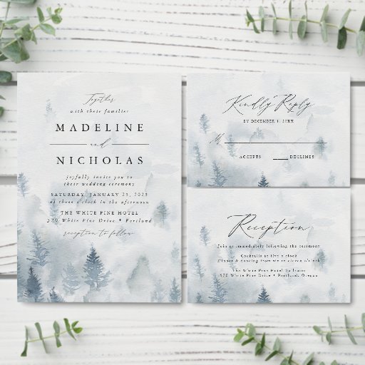 Elegante, winterliche Hochzeitskarten mit einem Empfang von scheußlich blauen und grauen Kiefernwäldern. Personalisieren Sie die Hochzeitskarten, indem Sie Ihre Empfang-Details hinzufügen. Entworfen, um sich mit unserer Hochzeitskollektion im eleganten Winterwald abzustimmen.