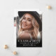 Eine einfache und elegante boho-inspirierte Abschlussanzeige mit einem modernen, hochkontrastreichen Look. Die Vorderseite zeigt ein großformatiges Foto mit einem schwarzen Farbverlauf am unteren Rand, wodurch der weiße Text klar und schön hervorsticht. Ändern Sie in „Jahrgang 2026“ oder jedes andere Jahr in sauberen weißen Schriftarten, gefolgt vom Namen des Absolventen und der Schule in raffinierter handgeschriebener Schrift für ein zeitloses und dennoch modernes Gefühl.