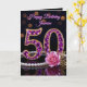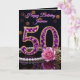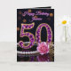 Feiern Sie ein halbes Jahrhundert funkelnder Brillanz mit dieser luxuriösen und glamourösen 50. Geburtstagskarte. Das Design zeigt eine atemberaubende, schmuckinspirierte Zahl "50", besetzt mit lila Amethyst-artigen Edelsteinen und in Gold gefasst. Die elegante Komposition wird durch eine Schnur klassischer Perlen, eine zarte rosa Rose und goldene Blätter vor einem anspruchsvollen schwarzen Hintergrund mit Bokeh-Lichteffekten akzentuiert.