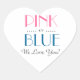 Eleganter Rosa- oder Blue-Gender-Aufkleber für Ihr Geschlecht offenbart Party. Weißer, herzförmiger Aufkleber mit rosa, blauen und grauen Schriftzeichen, auf dem Rosa oder Blau steht, Wir Liebe Sie! Für Gastgeschenke oder Spiele.