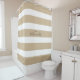 Das Badezimmer ist mit einem neuen, eleganten, beigefarbenen und weiß gestreiften Duschvorhang ausgestattet. Es ist mit breiten, horizontalen Streifen konzipiert und mit Familiennamen in trendiger Handschrift in der Mitte personalisiert. Klicken Sie auf die Option Vorlage personalisieren und geben Sie den Namen ein.