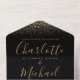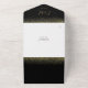 Alles in einer Hochzeitseinladung mit schicken goldenen Glitzer und eleganten Signatur-Script-Namen und Monogramm-Initialen auf schwarzem Hintergrund. Die Einladung enthält eine perforierte RSVP-Karte mit Ihrem Hochzeitswebseiten QR Code und Details. Entwickelt von Thisisnotme©