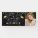 Modernes Abschluss-Banner mit einem handgeschriebenen Schriftzeichen-Schriftstil-Titel "CONGRATULATION TO UNUR GRADUATE", Imitats mit Metallfolienmützen oder -mörtel, Goldfetzen und Streichellampen und Foto, Name und Klassenjahr Ihres Absolventen mit einer bearbeitbaren schwarzen Hintergrundfarbe können Sie leicht in eine Schulfarbe, Party-Themenfarbe oder Lieblingsfarbe wechseln, indem Sie auf CUSTOMIZE FURTHER klicken PERSONALISIEREN HILFE: Für Hilfe bei der Modifikation/Personalisierung des Designs, bei Farbänderungen, bei der Übertragung des Designs auf ein anderes Produkt oder wenn Sie die Dinge koordinieren möchten, wenden Sie sich bitte an den Designer, BEVOR er die Bestellung über die Registerkarte Zazzle Chat MESSAGE oder per E-Mail an makeitaboutyoustore@gmail.com.