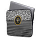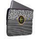 Ein schwarz-weißes Leopardenmuster mit schwarz-weiß gestreiften Streifen und ein elegantes Monogramm aus Gold und Schwarz zieren diesen Laptop-Ärmel. Personalisieren Sie es für sich selbst oder für ein Geschenk! Entworfen für Sie von BlackBerry Boulevard.
