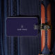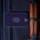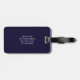 Modernes und stilvolles Gepäckanhänger mit mit Monogramm Initial- und Namen in weißer und geometrischer Form in Gold, um auf dunkelblauem Hintergrund zu personalisieren. Die Rückseite des Tags ist dunkelblau mit Ihrem Namen, Ihrer Adresse und Telefonnummer in weiß.