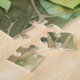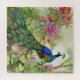 Puzzle Jigsaw mit dem Gemälde eines eleganten blauen und grünen Pfaues in einem üppigen Wald von rosa Blumen und Grün.