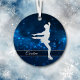 Dieses elegante Ornament besticht durch eine silberne Silhouette, einen weiblichen Eis-Skater vor einem hübschen blauen Hintergrund mit winzigen Sternlichtern. Ihr Name ist in Silber auf einem halbdurchsichtigen Banner, der in Glitzer mit weißen Imitaten gerahmt ist. Die Rückseite des Ornaments hat den gleichen blauen Hintergrund mit drei benutzerdefinierten Textfeldern in der Mitte. Perfekt für die Tochter, Enkelin oder Nichte, die ein Skater ist.