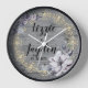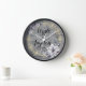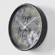 Auf dieser stilvollen Wanduhr befindet sich ein rustikales graues Holz mit einem eleganten, schicken, goldfarbenen blüh, kombiniert mit einem Lavendel-Blumenkranz, wo Sie es sich individuell gestalten lassen und romantische Eleganz im Bauernhaus schaffen. Teil der trendigen Geschenksammlung für Hochzeitsgäste