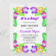 Diese elegante tropische Babydusche lädt zu einer modernen Sommerdusche ein. Das schlichte Design zeichnet sich durch gelbe, lila und magentafarbene Blume mit eleganter schwarzer Typografie auf weißem Hintergrund aus.