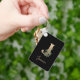 Eleganter schwarzer Schlüsselanhänger mit einem goldenen botanischen Monogramm in der Mitte.