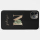 Das elegante schwarze Handy verfügt über ein goldenes botanisches Monogramm in der Mitte.