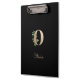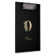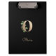 Die elegante schwarze Zwischenablage verfügt über ein goldenes botanisches Monogramm in der Mitte.
