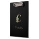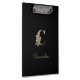 Die elegante schwarze Zwischenablage verfügt über ein goldenes botanisches Monogramm in der Mitte.